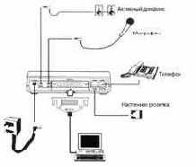 Выключив питание компьютера, с помощью прилагающегося кабеля подключите модем к любому свободному COM-порту компьютера (обычно COM2). Вставьте поставляемый в комплекте с модемом кабель в гнездо на задней стороне модема, а телефонный кабель — в розетку. Подключите адаптер постоянного тока к розетке на задней стороне модема.